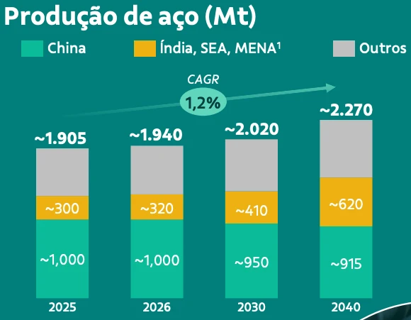 Com relação aos preços de minério de ferro, a companhia apresentou uma visão mais otimista do que o consenso. Do lado da demanda, apesar de esperar uma ligeira queda na China, a expectativa é de que esse recuo seja mais do que compensado pelo aumento na Índia, Oriente Médio e sudeste asiático.