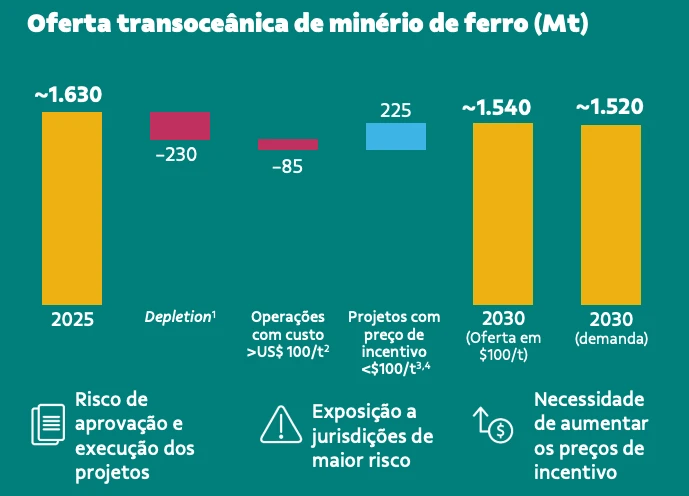 Do lado da oferta, o aumento de produção no gigantesco projeto de Simandou (representado pela barra azul do gráfico abaixo) será compensado pela exaustão das minas em atividade e pelo fechamento de capacidade de minas que queimam caixa nos patamares atuais do minério.