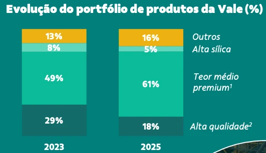 Ainda sobre o minério de ferro, a Vale detalhou um pouco mais a estratégia de adequar a qualidade do seu portfólio à demanda dos clientes. Historicamente, a companhia se destacou pela alta qualidade do seu produto, mas o mercado mudou nos últimos anos.