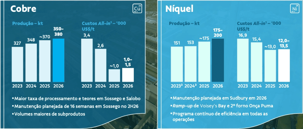 No lado positivo, os destaques ficaram com a redução de US$ 1 bilhão no Capex de 2026 ante o Vale Day anterior, economia de US$ 0,5 bilhão em gastos fixos vs 2025 e queda drástica de ~65% nos custos all-in do cobre, ainda que essa informação já tivesse sido adiantada em outubro.