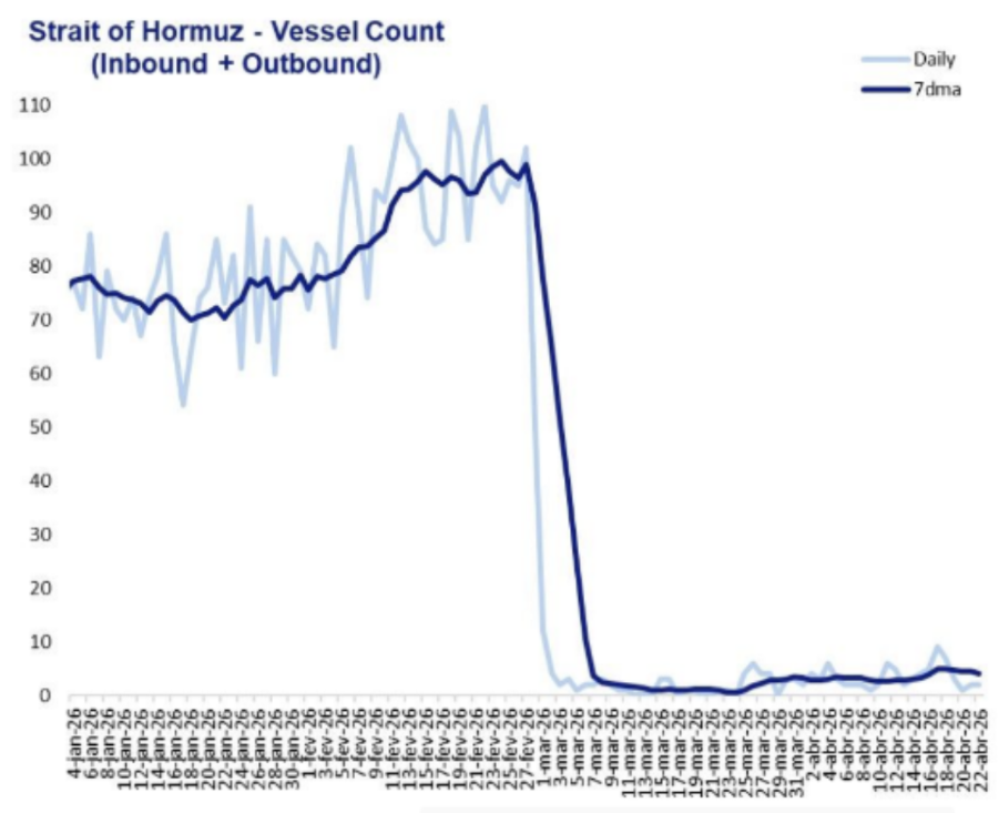 Desde o início do conflito, o fluxo de embarcações pelo Estreito de Ormuz — responsável por cerca de um quinto do petróleo global — saiu de algo próximo de 100 navios por dia para níveis próximos de zero e, desde então, apesar dos últimos avanços, a recuperação foi apenas marginal. A trégua não se traduziu em retomada do tráfego.