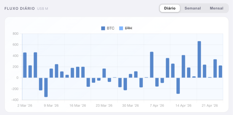 Os ETFs de Bitcoin à vista seguem nessa mesma linha. O saldo líquido de entradas desde o começo de março já passa de US$ 3,5 bilhões, e vem ficando ainda mais robusto em abril.