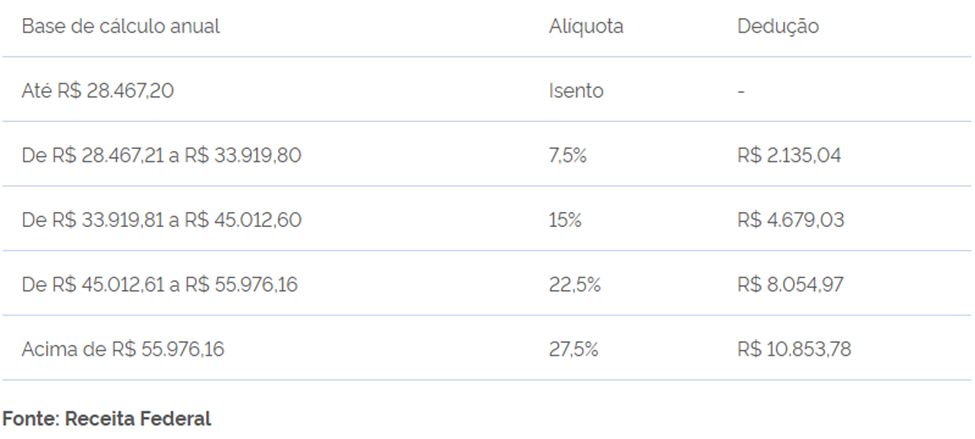 É a mesma lógica que você já vê no seu salário: quanto maior é a sua renda mensal, maior a alíquota de imposto que vai incidir, indo de 0% até 27,5%, seguindo as faixas da tabela do IR que nós já conhecemos.