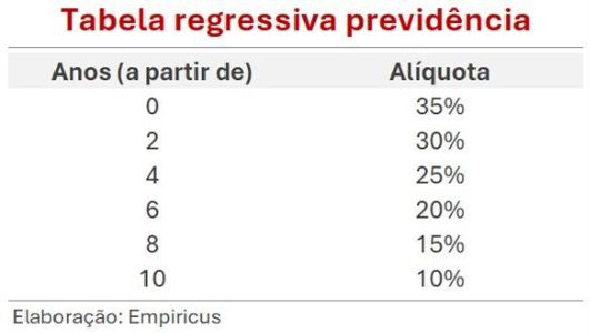 Veja que, a partir de 10 anos, a alíquota cai para apenas 10%, valor que nenhum outro investimento oferece. Como a previdência é um investimento de longo prazo, especialmente para a aposentadoria, atingir essa faixa acaba sendo uma tarefa relativamente fácil.