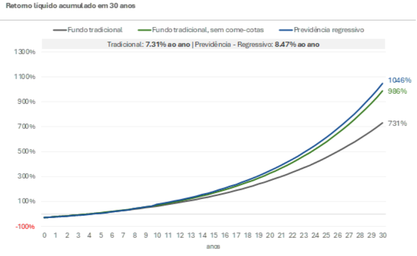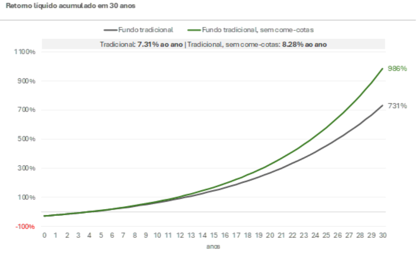 Estimamos que, em 10 anos, a ausência de come-cotas te garante um retorno adicional de 0,5% ao ano. No longuíssimo prazo, em um horizonte de 30 anos, por exemplo, essa diferença chega a 1% ao ano.