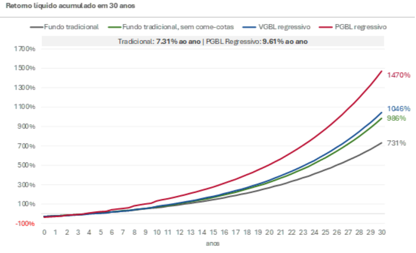 O VGBL funciona de maneira semelhante aos fundos tradicionais, mas com o benefício da isenção do come-cotas e da alíquota de IR menor. Ele é basicamente aquela linha azul que adicionamos no gráfico anterior.