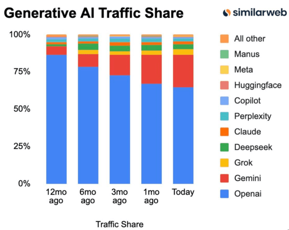 A participação de mercado da Gemini atingiu 22%, um aumento em relação aos 19,5% de apenas um mês atrás e aos 13,3% de três meses atrás.