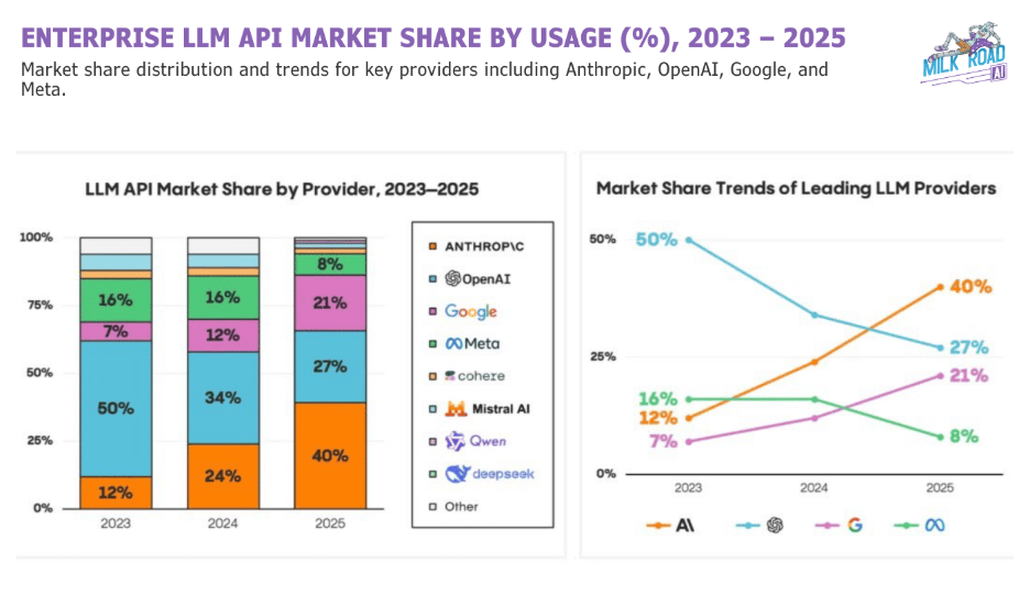 - Em 2025: a participação da OpenAI despencou para 27%. Já a da Anthropic (Orange) disparou para 40%.