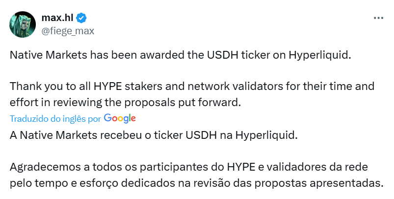 - Native Markets ganha a corrida pela stablecoin USDH, da Hyperliquid: Após um processo de votação comunitária conturbado, a Native Markets garantiu o ticker USDH para a stablecoin atrelada ao dólar da Hyperliquid. O lançamento começará com uma fase de testes com transações limitadas, seguida pela abertura do livro de ordens spot USDH/USDC e a remoção desses limites. O processo de seleção atraiu críticas de executivos da indústria, que alegaram um resultado previamente definido em favor da Native Markets, levantando controvérsias sobre o que foi apresentado como um processo competitivo aberto entre vários emissores de stablecoins, incluindo players estabelecidos como Paxos, BitGo e Ethena.