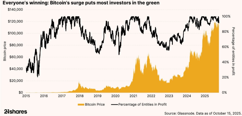 Desde o lançamento dos ETFs spot de Bitcoin em janeiro de 2024, a porcentagem de entidades que estão ganhando dinheiro com Bitcoin nunca ficou abaixo de 80%, mesmo com os estresses macroeconômicos, como por exemplo quando tivemos o episódio do carry trade japonês no 3T24, ou quando tivemos a volatilidade nos mercados por conta das tarifas ao longo desse ano, ou até mesmo na semana passada com o choque geopolítico somando com a Binance fora do ar.