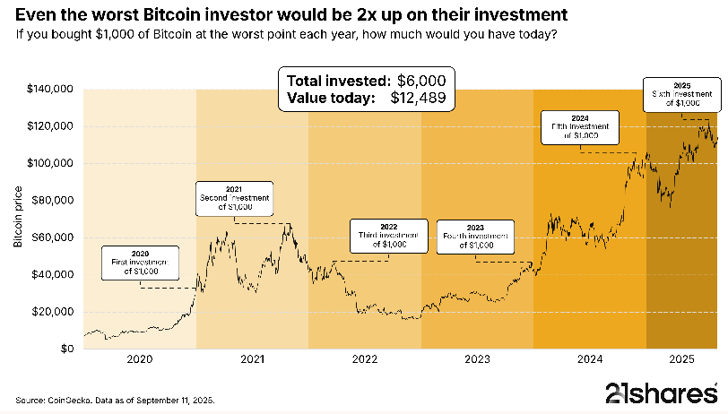 O que esse gráfico nos mostra é que mesmo que você comprasse 1.000 reais em Bitcoin todo ano na máxima do ano desde 2020, você ainda sim teria duplicado seu investimento.