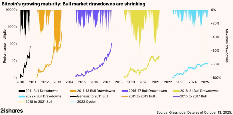 Esse gráfico nos mostra que o Bitcoin está ganhando maturidade, uma vez que as quedas nos bull markets estão cada vez menores.