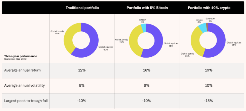 No gráfico abaixo, o pessoal da 21shares fez um estudo comparando um portfólio tradicional (60% ações / 40% renda fixa) com um portfólio mais moderno, com alocação em cripto. A comparação é ilustrativa, baseada em dados históricos dos últimos três anos.