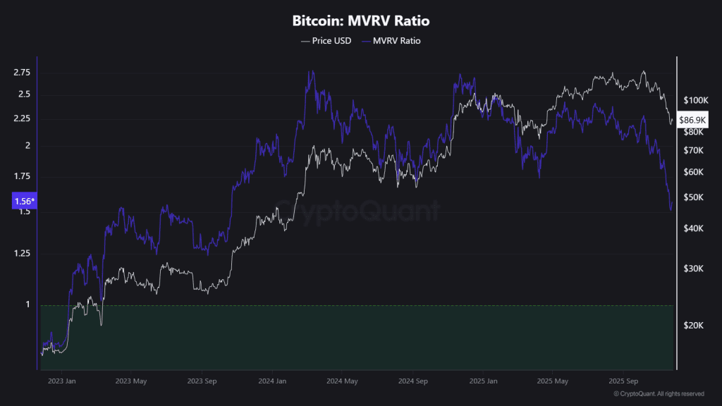 O MVRV (Market Value to Realized Value) é um indicador on-chain, que compara o valor de mercado atual (preço atual multiplicado pela oferta em circulação) com o valor realizado (preço médio pelo qual cada BTC foi movimentado pela última vez na rede).