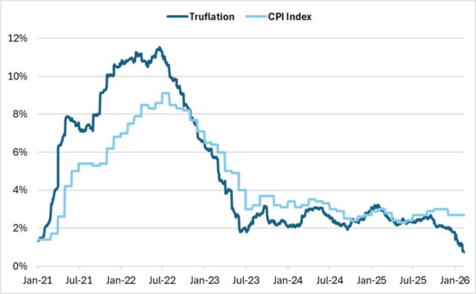 Historicamente, as duas métricas apresentam uma forte aderência, caminhando em direções semelhantes, mas a imagem atual revela uma divergência sem precedentes: o Truflation despencou para sua mínima histórica, descolando-se significativamente do CPI. Esse movimento sugere que a inflação real, na ponta do consumo, já arrefeceu de forma muito mais drástica do que o CPI consegue demonstrar no momento.