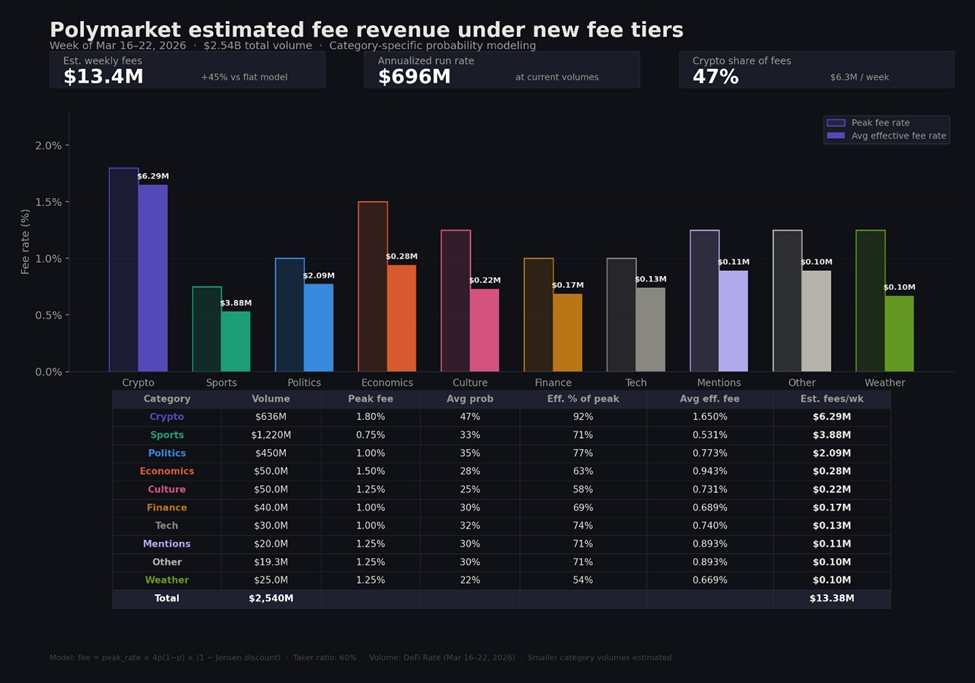 Agora, com volumes já relevantes (cerca de US$ 2,54 bilhões na semana analisada), a introdução de taxas passa a monetizar essa base. O modelo projetado indica aproximadamente US$ 13,4 milhões por semana (cerca de US$ 696 milhões anualizados), com destaque para a categoria de Crypto, responsável por quase metade da receita (aproximadamente 47%).