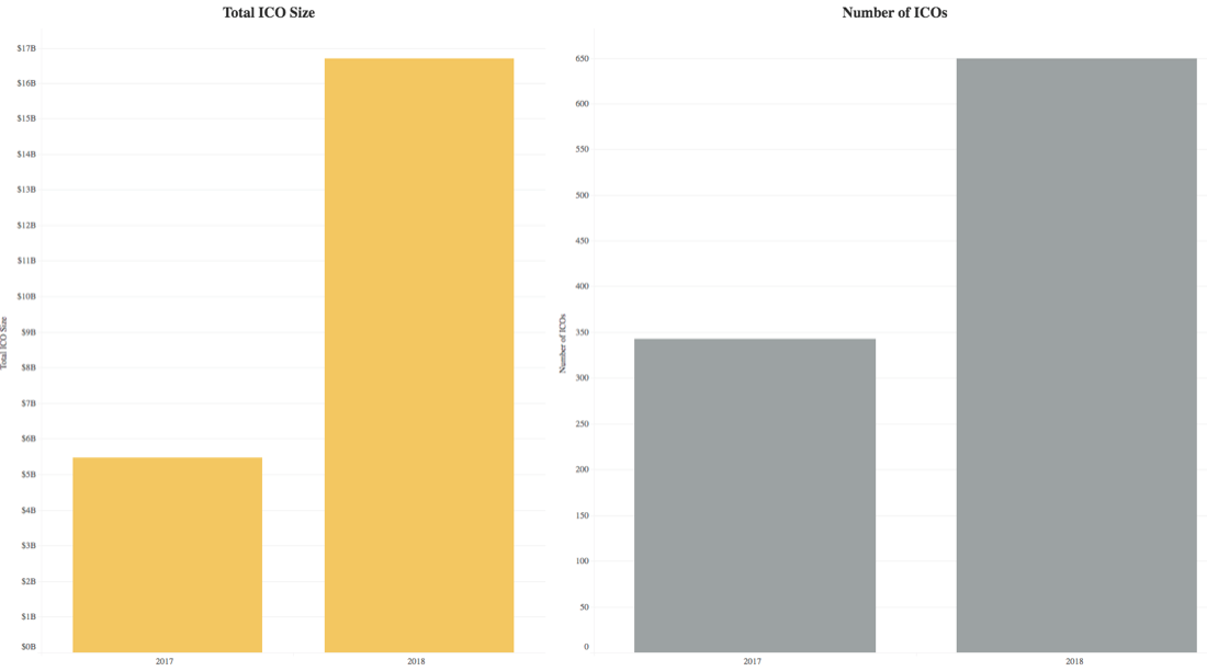 Tamanho em captação e número dos ICOs em 2017 e 2018