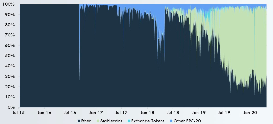Atualmente a que vejo tomando conta com mais força das liquidações diárias do protocolo é a das stablecoins, que se refere à tokenização de moedas fiduciárias, em sua maioria do dólar.