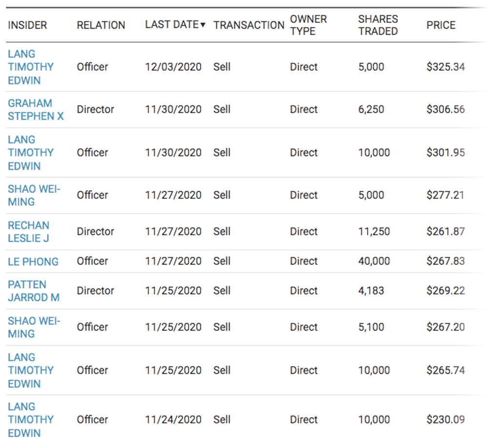 Nos últimos três meses, um total aproximado de 220 mil ações foi vendido em 25 oportunidades por pessoas da companhia, o que em valores atuais representa quase US$ 64 milhões.