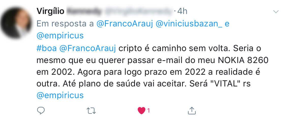 Apesar de ser sempre o meu esforço e do Vinícius trazermos para você analogias e pontos de vistas que provem a nossa tese sobre o futuro das criptomoedas, quando vejo que alguém assimilou o conceito tão bem, fico surpreso.