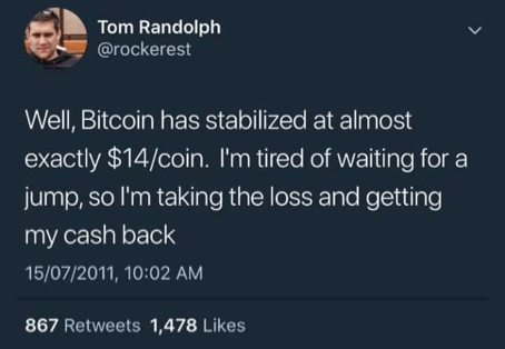 “Bem, o bitcoin estabilizou aproximadamente em 14 dólares por moeda. Eu estou cansado de esperar um salto, então vou assumir minhas perdas e pegar meu dinheiro de volta.”