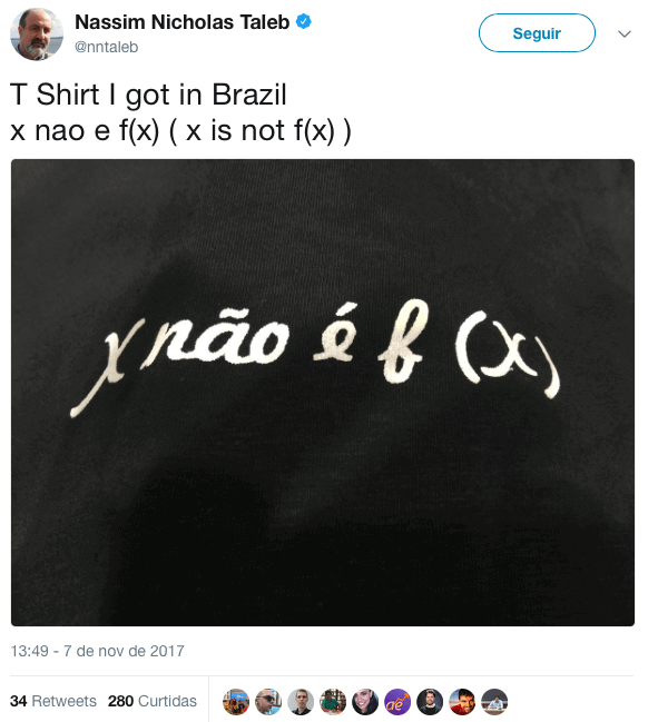 Se eu pudesse escolher uma coisa para transmitir para você, seria o resumo x não é f(x). Não é brincadeira. Eu apresentei o Taleb no evento da HSM e também no nosso com uma camisa com essa coisa escrita. Inclusive demos uma igual pra ele, atendendo a pedidos do próprio (você não sabe a correria que foi fazer tudo em poucas horas, mas deu certo! Obrigado, time). X é a realidade ou o que você pensa sobre ela. F(x) é como você se expõe àquilo. São coisas bem diferentes e o que importa mesmo é a exposição.