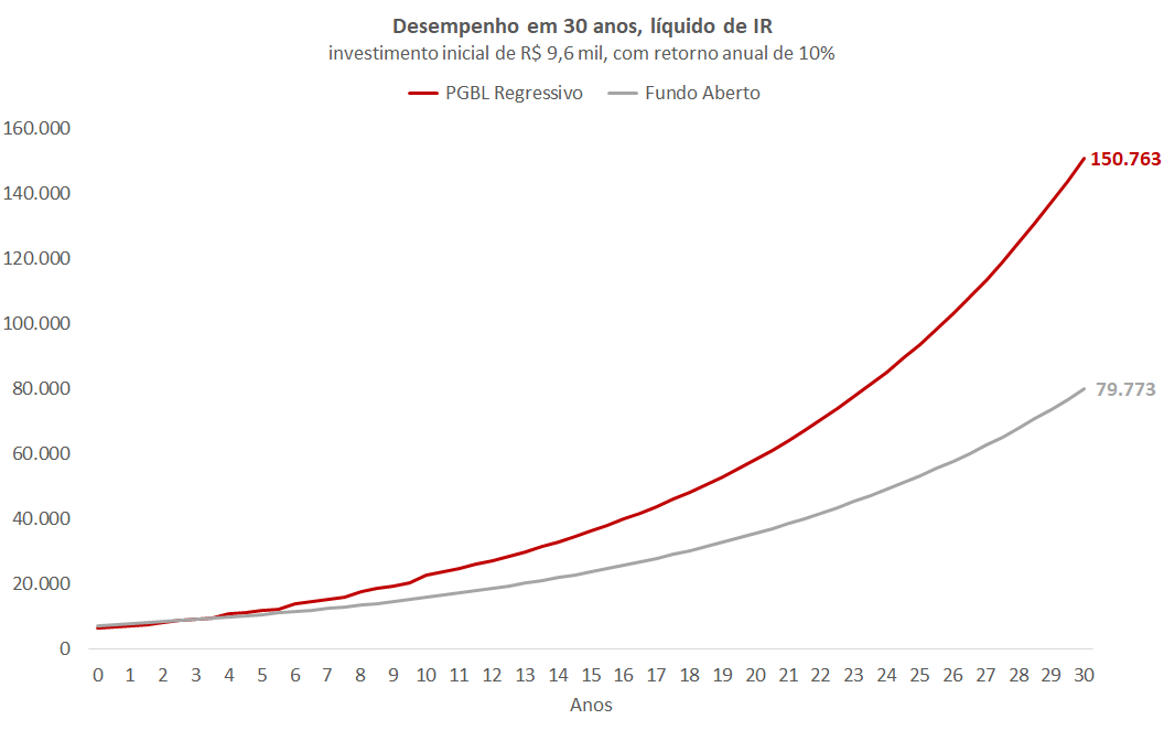 Em 30 anos, esses R$ 9,6 mil se transformariam em mais de R$ 150 mil em um plano de previdência PGBL com regime regressivo, enquanto um fundo aberto com a mesma estratégia e mesma rentabilidade (premissa de 10% ao ano) ainda valeria menos da metade, próximo a R$ 80 mil. A grande diferença é resultado da dedução fiscal de 12%, da inexistência do come-cotas e da opção pelo regime tributário regressivo.