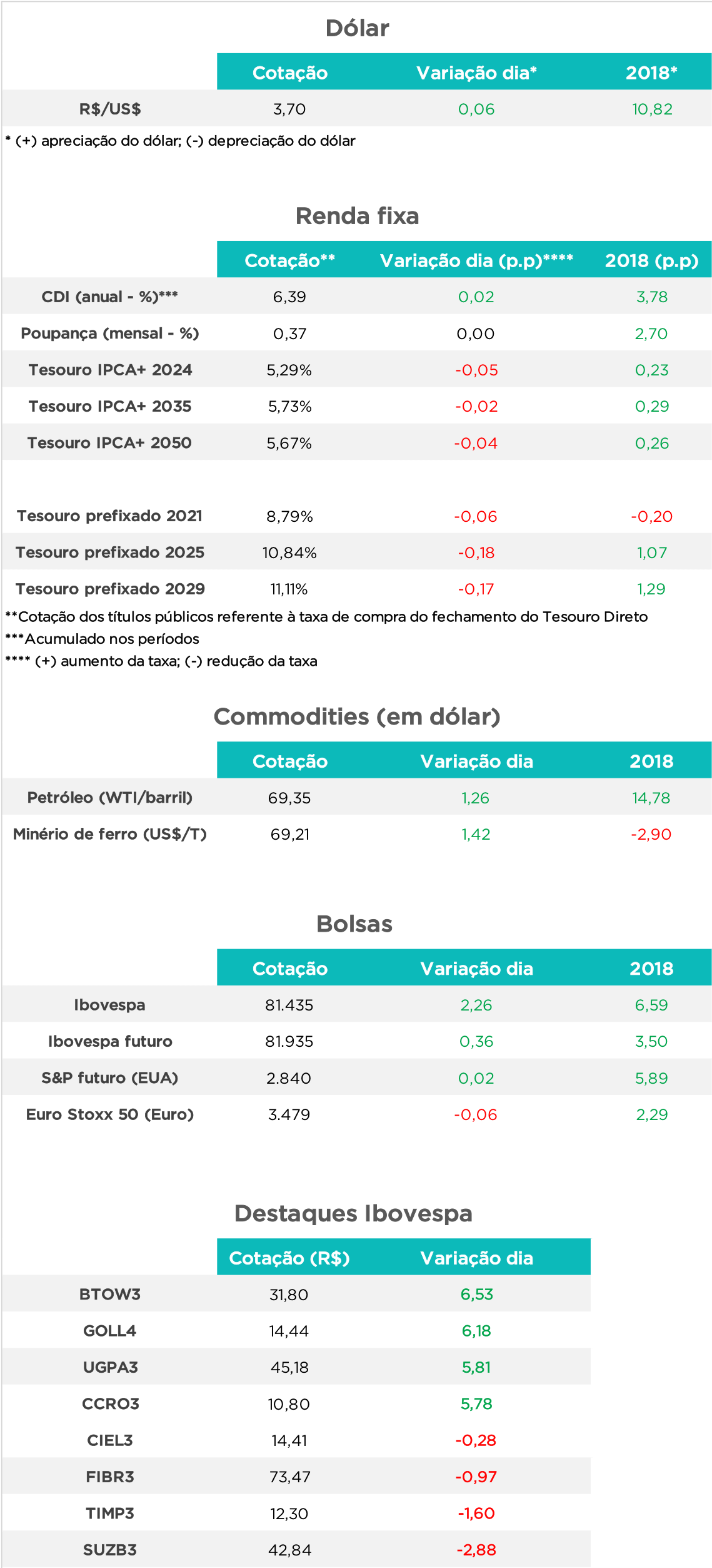 Pesquisa Ibope com eleitores de SP na noite de sexta-feira mostrou aumento das intenções de voto no candidato tucano, agora à frente de Bolsonaro nessa amostra. Já o candidato do PSL teria encontrado um revés com a nomeação do General Mourão para vice de sua chapa – o militar dificultaria a atração do voto mais moderado, inibindo o avanço de Bolsonaro para eleitores de centro.