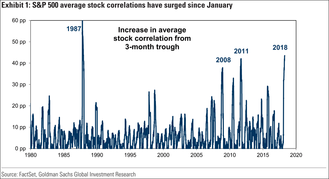 Conforme você pode ver no gráfico, só uma vez na história a correlação das ações do S&P esteve acima do patamar atual: em 1987, ano marcado pela famosa Segunda-Feira Negra, quando a Bolsa dos EUA caiu “só” 22 por cento num único dia.
