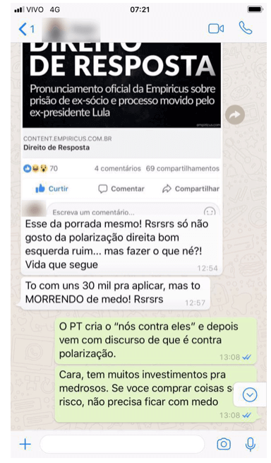 Essa é uma foto real do meu WhatsApp. Começa com a patrulha de sempre da esquerda — se você perguntar, ele vai dizer: “não sou petista”. Claro, apenas vota no PT. Desconsidera essa parte. Foca no “To com uns 30 mil pra aplicar, mas to MORRENDO de medo!”.