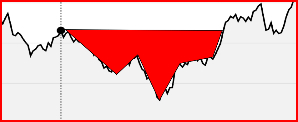 Visualmente, o drawdown é a área do gráfico hachurada até que o ativo recupere seu último pico.