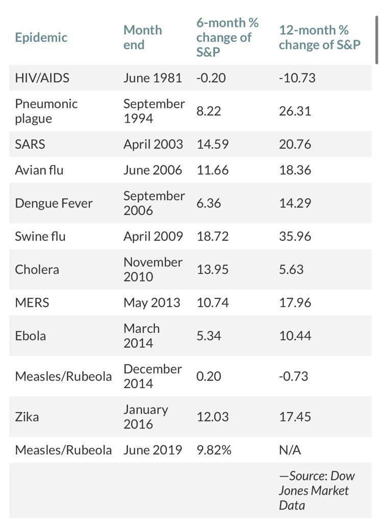 A tabela abaixo, feita pela Dow Jones, mostra o desempenho do S&P 500 seis meses e doze depois das últimas epidemias: