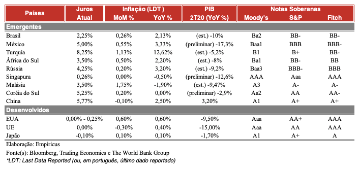 Que tal um bond do Itaú pagando 5% ao ano em dólar? Ou Banco do Brasil a 6%? Ou mesmo o aproveitamento de outros papéis soberanos lá fora? Veja na tabela abaixo como existe hoje uma oportunidade de se aplicar na renda fixa mexicana, cujos juros seguem muito altos, mesmo diante de uma depressão do PIB, de uma inflação bem comportada e de um rating soberano bastante razoável: