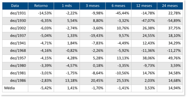 A tabela abaixo contempla os dez piores meses de dezembro para o índice de ações norte-americano desde 1930 e o que aconteceu depois. As variações são todas de preço, sem contar dividendos.