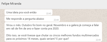 Minutos de conversa depois, ficou claro: a provocação era para que eu me colocasse no lugar de um dos gestores de fortuna. Quais são minhas convicções hoje e quais são os fundos que compartilham dessas convicções no horizonte de 14 meses, até o final de 2020?
