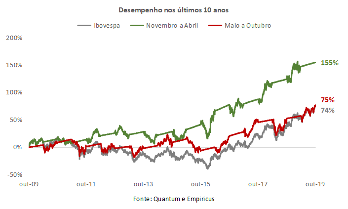 Seis meses depois, trago o caso oposto para reforçar o investimento em ações: nos últimos dez anos, o investidor que entrou em Bolsa no último dia de outubro e saiu no último dia de abril (linha verde), trocando para o CDI, teve um desempenho duas vezes maior do que o Ibovespa (linha cinza) ou daquele que se posicionou nos meses alternados (linha vermelha):