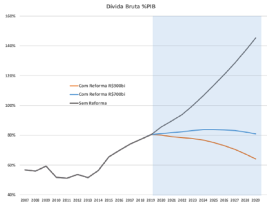 Objetivamente, temos, sim, dificuldades de cumprir com o teto de gastos e com a regra de ouro para 2020 e 2021, mas uma reforma da Previdência de 900 bilhões de reais faz o Brasil entrar numa trajetória de convergência da relação dívida pública como percentual do PIB. Para isso, suponho uma retomada no crescimento, mas nada espetacular, pois acho sinceramente que temos condições disso, em especial com os bancos privados agora dando início ao processo de crowding-in (preenchimento do espaço deixado pela redução da carteira de crédito de bancos públicos, sobretudo BNDES), notadamente no nicho de pequenas e médias empresas. Esse foi um grande detrator do PIB nos últimos anos e deve ser agora um bom propulsor.