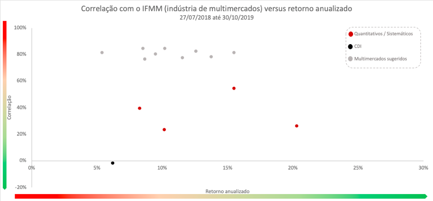 As bolinhas na cor cinza representam alguns dos nossos fundos multimercados preferidos. Eles entregam retornos distintos, como você pode ver, mas repare no eixo à esquerda. São bem correlacionados entre si, tomando por base o IFMM, benchmark para a categoria. Já em vermelho estão alguns dos fundos quantitativos em que estamos de olho.