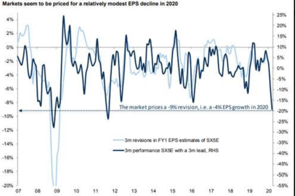 Outro ponto importante se refere ao quanto os valuations ainda não incorporam uma queda tão expressiva dos lucros, mas apenas uma contração modesta, algo em torno de 9% para o caso da Europa. O gráfico abaixo mostra isso: