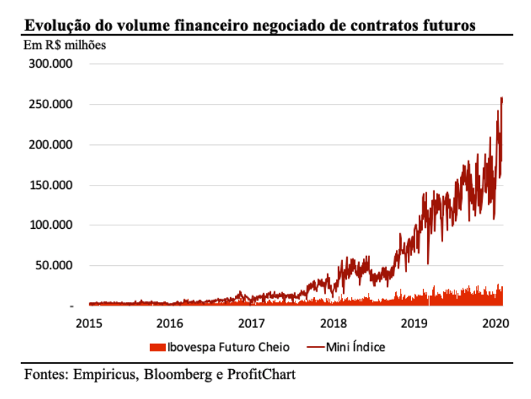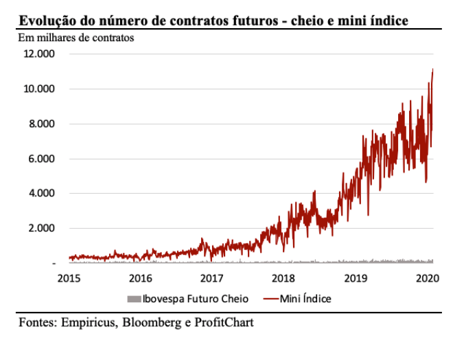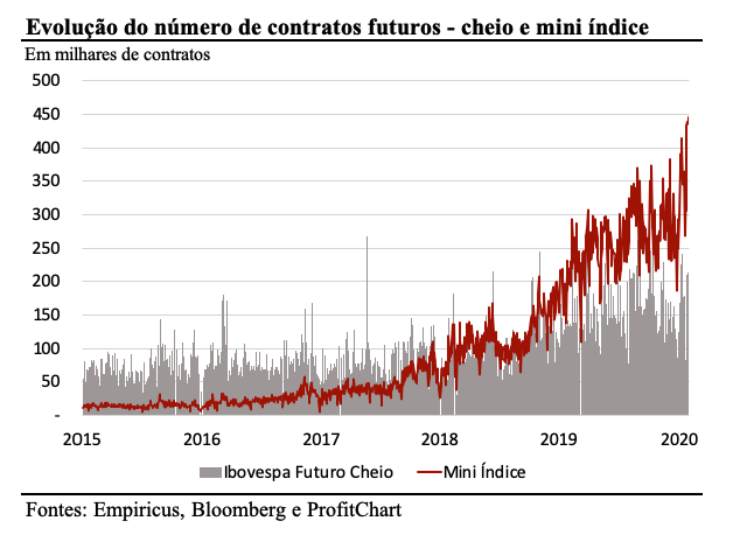 Basicamente, eles mostram a mesma coisa: a evolução desproporcional de negociação de minicontratos de Ibovespa Futuro relativamente aos contratos cheios. Isso é, entre outras coisas, um indicador potencial da maior participação da pessoa física nesse segmento.