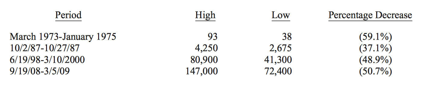 Vamos ao que realmente interessa. Mais uma vez pegando as palavras da carta, numa tradução livre, e certamente muito ruim feita por este redator que mal fala português: “A Berkshire, em si, oferece um exemplo vívido de como a volatilidade de curto prazo dos preços das ações pode obscurecer o crescimento de valor no longo prazo. Durante os últimos 53 anos, a companhia criou valor reinvestindo seus lucros e permitindo que a mágica dos juros compostos fizesse seu trabalho. Ano após anos, nós nos movemos para frente. Ainda assim, as ações da Berkshire sofreram quatro grandes quedas, detalhadas na tabela abaixo”: