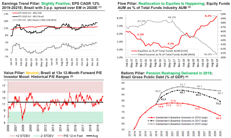 Depois, entendo que há boas evidências de que existe, sim, uma alteração dos fundamentos da economia brasileira e dos lucros corporativos. Pode até haver algum elemento especulativo aqui e ali, mas certamente não é só um elemento especulativo. O PIB volta a crescer, temos uma convergência da trajetória da dívida pública a partir da reforma da Previdência, os valuations podem não ser baratos, mas também não são absurdos, e a Selic está na mínima histórica, de onde não deve sair por um bom tempo. Com isso, é natural esperar uma migração de investimentos, seja de pessoas físicas, seja de fundos de pensão, para a Bolsa. Há um slide no relatório anual do Santander que resume bem a história:
