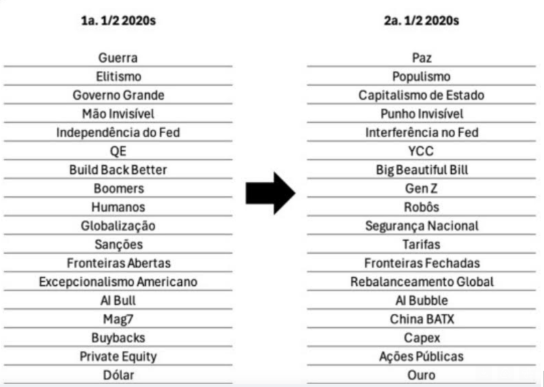 O estrategista Michael Hartnett, do Bank of America Merrill Lynch, por exemplo, tem defendido uma segunda metade da década de 2020 bem diferente dos cinco anos vindouros. A imagem abaixo ilustra a transformação sugerida: