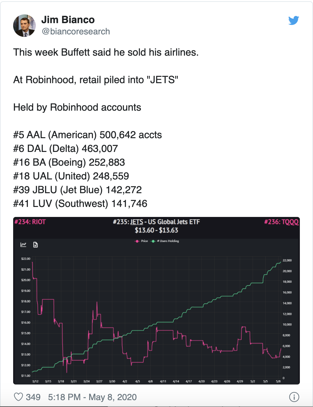 O comportamento visto agora em Hertz é uma repetição do ocorrido algumas semanas antes com as empresas aéreas. Diante das grandes dificuldades setoriais e logo após Warren Buffett ter anunciado a zeragem de suas posições no setor, o número de acionistas das aéreas só fez aumentar, conforme sintetizado no Twitter de Jim Blanco: