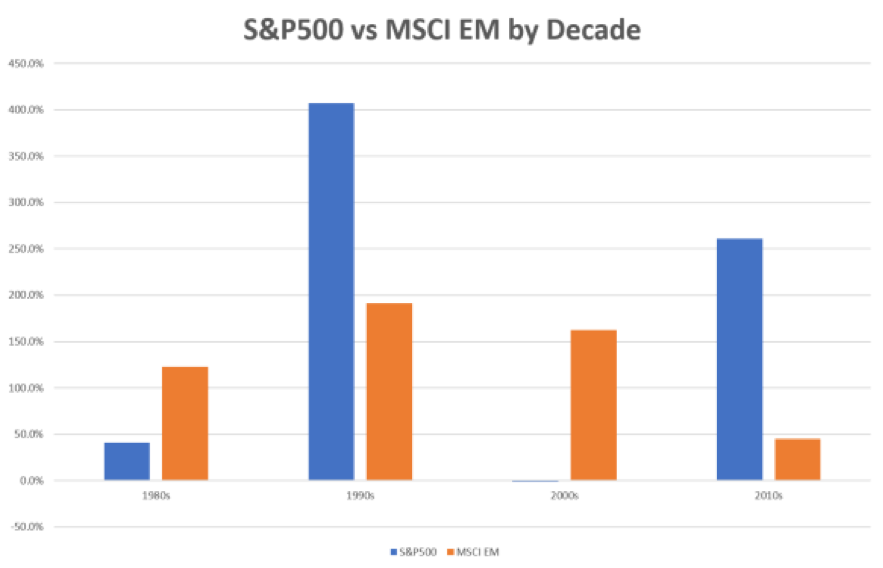 Começa então a nascer um entendimento revigorado de que os emergentes podem voltar a ficar mais atrativos. Se olharmos por década (gráfico abaixo), esses mercados (em laranja) costumam se alternar com os desenvolvidos (em azul) em termos de performance de Bolsa.