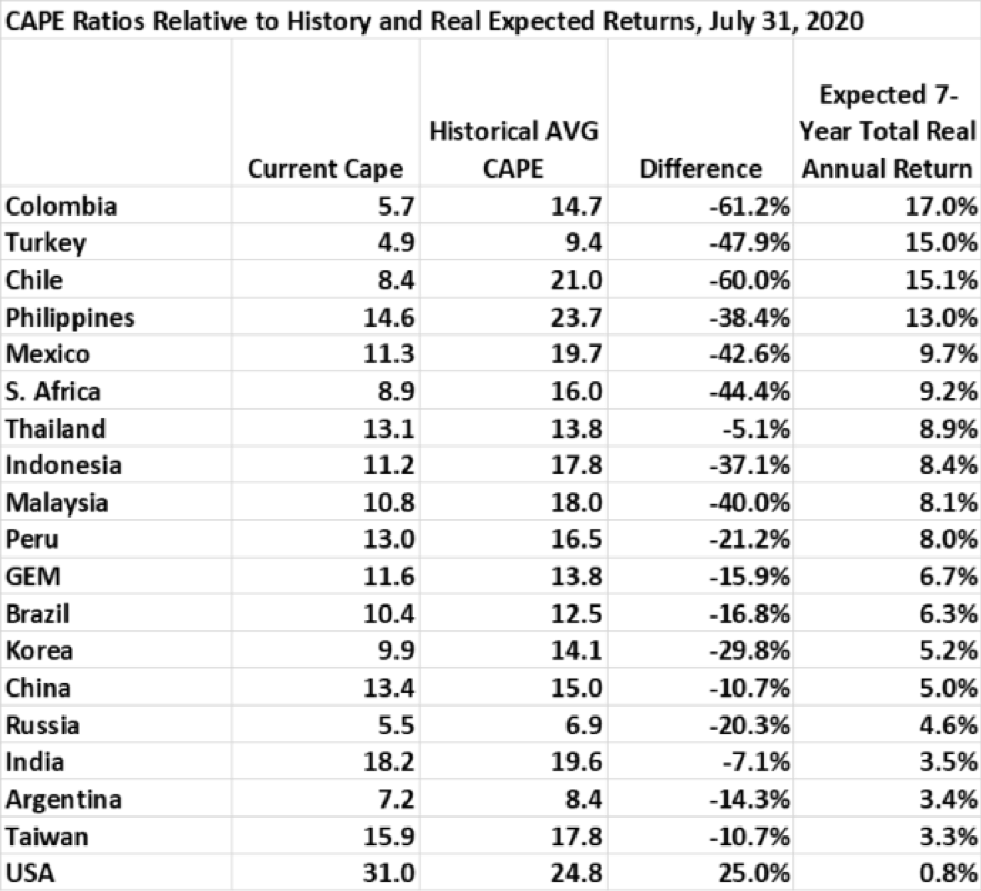 Brasil, Colômbia, Turquia, Chile, Filipinas, México e África do Sul são negociados com descontos muito acentuados em relação às avaliações históricas e fornecerão retornos elevados se ocorrer uma reversão à média. Atualmente, os mercados estão precificando perspectivas econômicas difíceis para esses países.