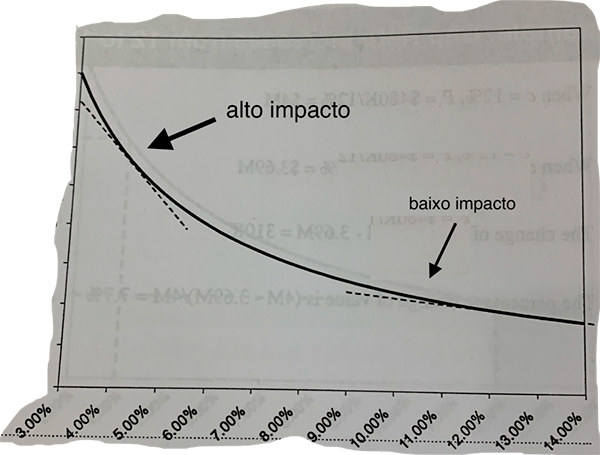 Devido à convexidade da transmissão do efeito dos juros sobre a economia, cortes em níveis menores exercem muito mais impacto (quase verticais) do que cortes nos níveis maiores (quase horizontais).