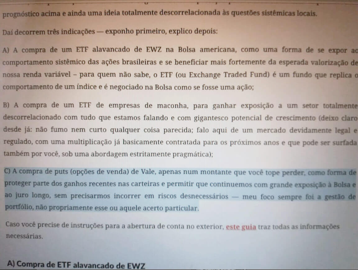3 – Do ponto de vista prático, peço gentilmente aos assinantes das séries Palavra do Estrategista e Carteira Empiricus para que se mantenham atentos aos seus e-mails e SMSs ao longo do pregão. Ainda nesta segunda-feira, entrarei em contato sugerindo o que fazer em relação às puts. Sobre as ações de Vale especificamente, que já devem abrir em forte gap de baixa (não adianta correr), estamos produzindo uma publicação profunda e diligente, a ser enviada também ainda hoje. Já comentei o assunto no Telegram que tenho mantido para os assinantes do Palavra, mas quero fazer algo mais parrudo – se você ainda não está no grupo do Telegram, cadastre-se aqui.