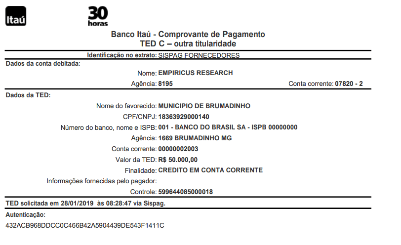 Estimulado pelo e-mail apresentado aqui na segunda imagem que abre esta newsletter (sim, ele é real – escondo o nome do remetente apenas por questão de privacidade), resolvi, em nome da Empiricus, fazer uma pequena doação em dinheiro para ajudar na recuperação do local. O comprovante da transferência está abaixo: