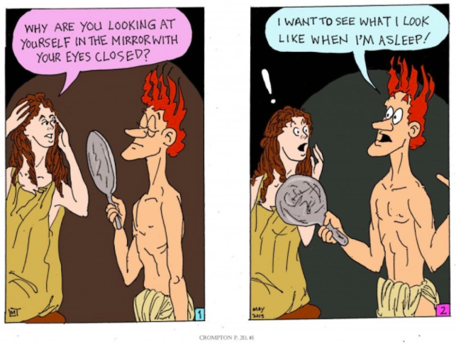 No exemplo abaixo, a moça quer saber por que o sujeito está “se olhando” no espelho com os olhos fechados.